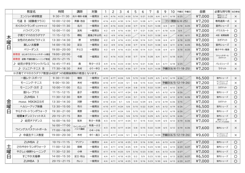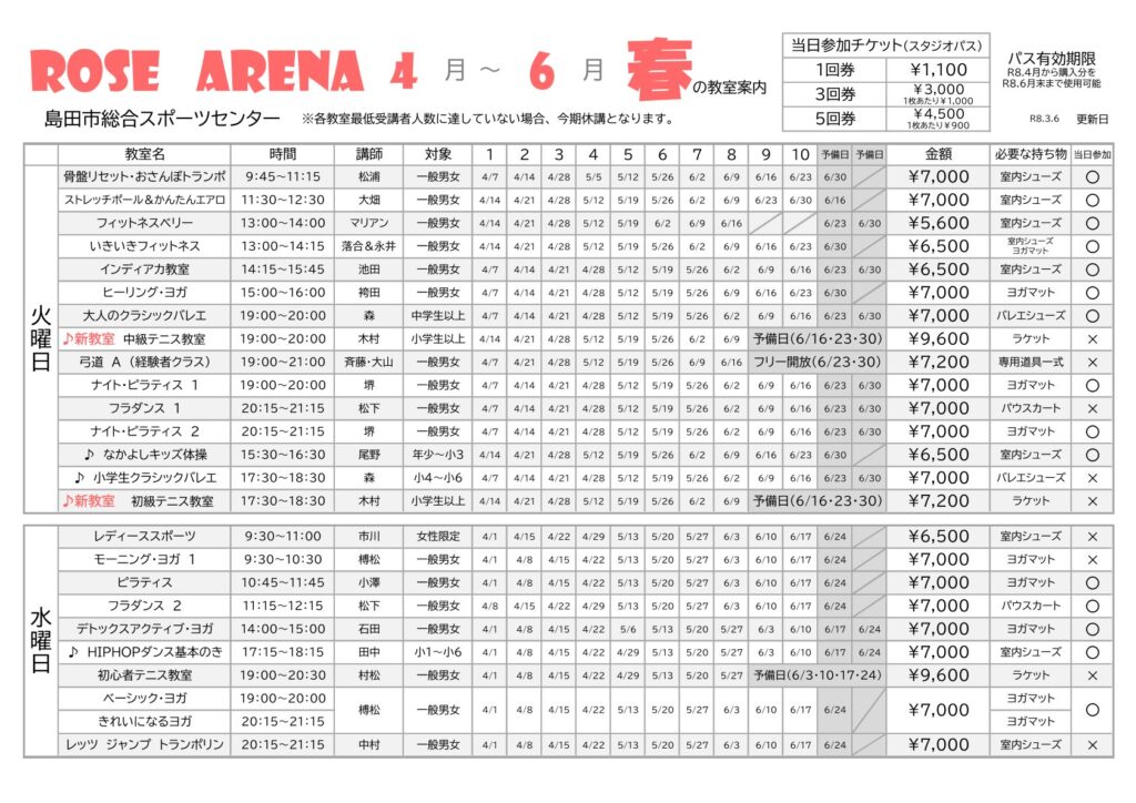 令和8年度第一期スタジオ教室のお知らせ 2026年3月6日 最終更新日時 : 2026年3月6日 スタッフローズアリーナ 日頃より、ローズアリーナをご利用いただき誠にありがとうございます。 ローズアリーナスタジオ教室 第1期(4月~6月)、スタジオ教室の日程をお知らせいたします。